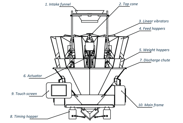 The weigher will have several features, including weigh buckets, feed buckets, infeed funnel, feeder pans, top cone, collating chute and collating funnel.